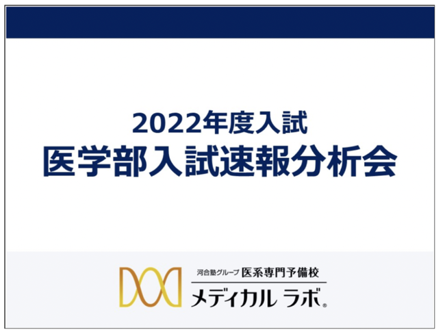 医系専門予備校として合格者数No.1(「ショッパーズアイ」調べ/2021年度入試 医学部医学科合格者1,289名)、全国に28校を展開する医系専門予備校メディカルラボでは、最新の入試結果をもとに「2022年度 医学部入試速報分析会」を全国の会場で開催いたします。2022年度の試験が昨年とどう変わったか、1年後に向けた合格への戦略はどう立てればよいかなど、これを聞けば、医学部入試が丸ごとわかります。ライバルより1日でも早く、スタートラインに立ちたい医学部合格を目指す受験生、ご家族必聴の講演会です。