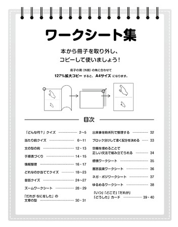 ゲームや作文で使うカードやワークシートは、巻末の別冊を取り外し、A4サイズでコピーして、少人数・クラス授業、個別支援などで使えます。