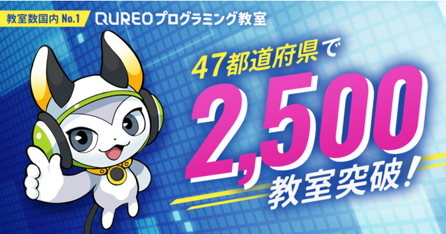 株式会社CA Tech Kidsと株式会社スプリックスとの合弁会社である、プログラミング教材の開発・運営・販売事業を行う株式会社キュレオ(本社:東京都渋谷区、代表取締役社長:上野朝大)は、運営する小学生のためのプログラミング教室「QUREO(キュレオ)プログラミング教室」が、国内47都道府県で2,500教室を突破したことをお知らせいたします。小学生を対象としたプログラミング教室において、引き続き国内No.1の教室数となります(※1)。