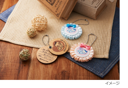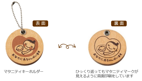 ご好評いただいているピンクとブルーのロゼットキーホルダーに加え、創業90周年を記念して、やさしい木のぬくもりを感じる「マタニティキーホルダー」が登場します。スライド面には赤ちゃんへのメッセージが書き込めるようになっています。ひっくり返ってもマタニティマークが見えるよう両面印刷がされ、ナチュラルなモノトーンのカラーで、デザインも機能もやさしさが詰まったキーホルダーです。