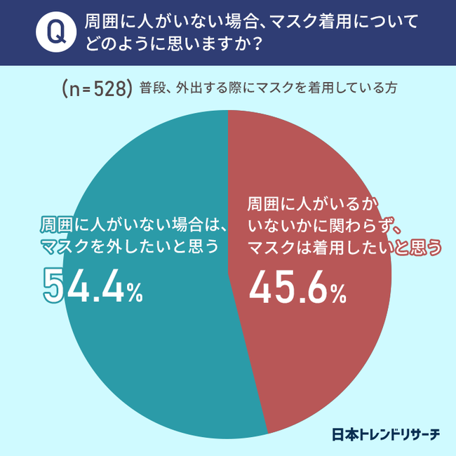 54.4%の方が「周囲に人がいない場合は、マスクを外したいと思う」と回答しました。