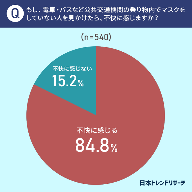 まずは、電車・バスなど公共交通機関の乗り物内でマスクをしていない方を見た場合について聞きました。