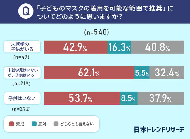 「小さい子供にはマスクを付けるリスクが大きい」という意見もありましたが、実際に未就学の子供がいる方も42.9%が「賛成」と回答していました。