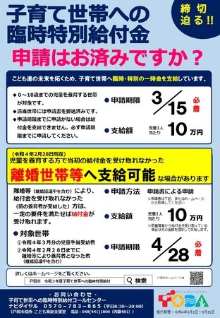 埼玉県戸田市は、国の「子育て世帯への臨時特別給付金」について、基準日より後に離婚等によって新たに対象児童の養育者となっているにもかかわらず給付金を受け取れなかった方に対し、国の方針に基づき支給します。