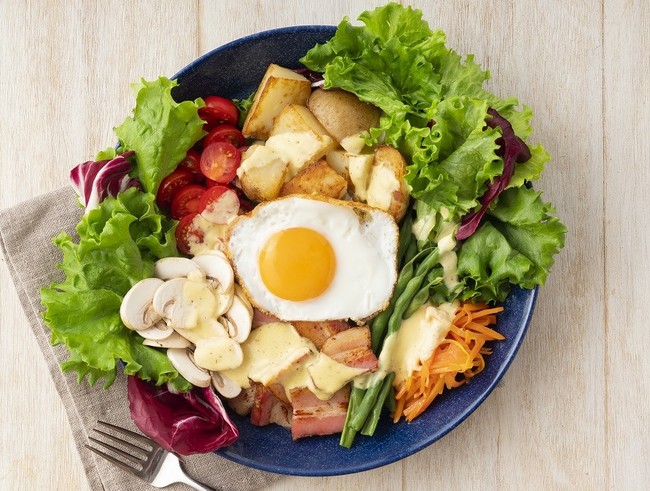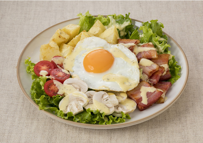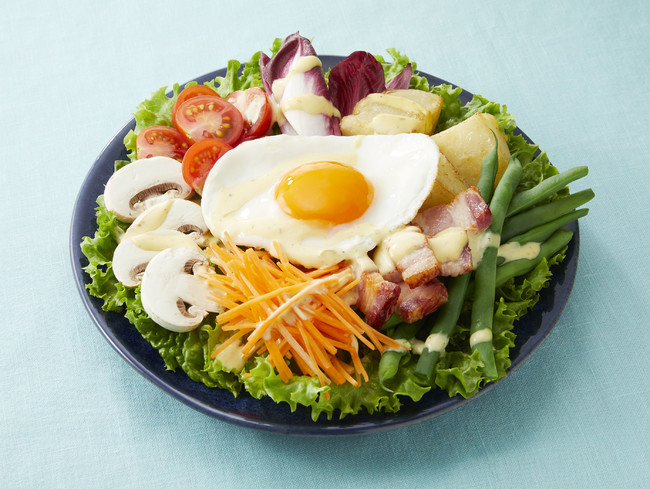 キユーピーが提案する、基本のペイザンヌサラダです。大きめにカットしたベーコンやじゃがいもが食べ応え抜群です。中央にのせた目玉焼きやゆで卵が目を引きます。