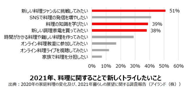 また、家庭では内食機会の増加に伴い「レパートリー不足」の悩みが顕在化すると同時に、新しいメニューへの興味・関心も高まっています(下記グラフ参照)。市販用から「ペイザンヌサラダ ドレッシング」を発売することで、内食に新たなサラダメニューを提案し、サラダトレンドの創出を図るとともに、定番サラダへの育成を目指します。