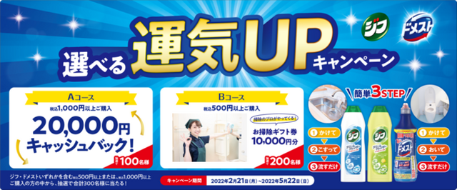掃除のしづらい箇所にもかけて、おいて、流すだけで除菌、洗浄ができる「ドメスト 除菌クリーナー」と、かけて、こすって、流すだけで頑固な汚れも落とすことのできるクリームクレンザー「ジフ」のどちらかを含む、1,000円(税込)以上をご購入のお客様から100名様に「Aコース 20,000円のキャッシュバック」を、また、500円(税込)以上をご購入のお客様から200名様に「Bコース お掃除ギフト10,000万円分」をプレゼントいたします。当選発表については、応募締切後、厳正なる抽選のうえ、ご当選者様へ賞品の発送をもってかえさせていただきます。