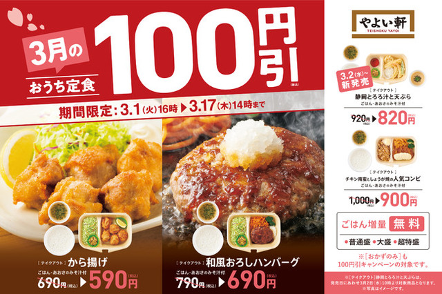 株式会社プレナスは、定食レストラン「やよい軒」を、2022年1月末現在373店舗展開しております。「やよい軒」では、ご自宅などでも店舗と同じように定食をお召し上がりいただけるよう、ごはん・汁物・おかずを、別々の容器で提供するテイクアウトメニュー『おうち定食』を販売しております。このたび、3月1日(火)16時より3月17日(木)14時までの期間、『おうち定食』4商品※1を100円引きの特別価格で提供するキャンペーンを実施いたします。
