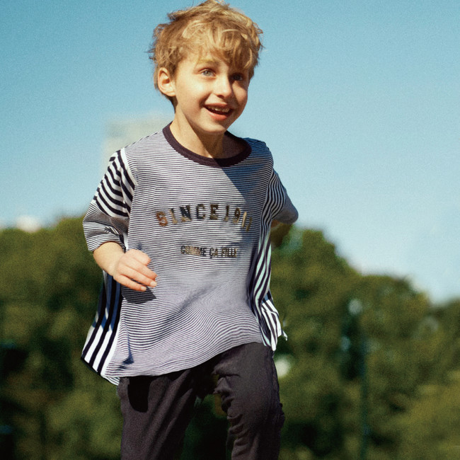 遊び心のある服を着て、新しい季節を元気良く過ごしてほしいと考え、細いボーダーと太いボーダーの組み合わせが新鮮なアイテムを作りました。遊び心のあるデザインに、前身頃のプリントをガンメタリックの箔でプリントすることで、大人っぽい雰囲気をプラスし、子供っぽくなりすぎないデザインに仕上げました。