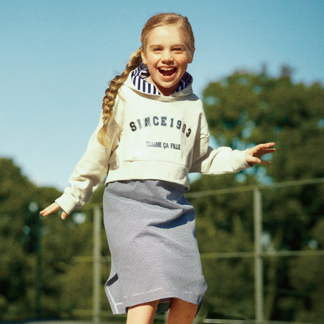 フード裏とスカート部分のボーダーは太さを変えることで、遊びをプラスし元気な印象に仕上げました。