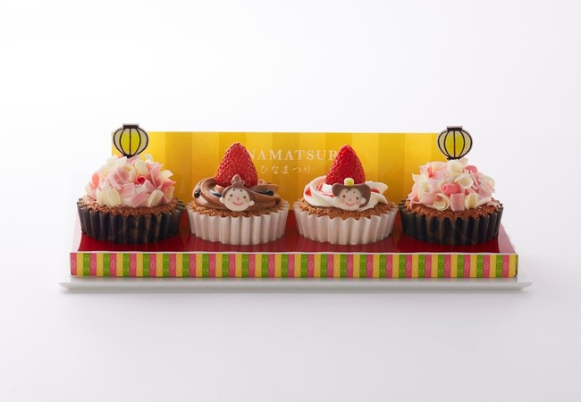 ひなまつりのデコレーションを施した華やかなカップケーキの詰合せ。おひなさま (中右)とおだいりさま(中左)には、ふわふわスポンジの中に、手炊きのカスタードクリーム、春てまり(ミニ)(両端)にはいちごクリームが入っています。