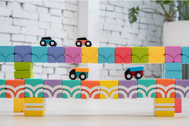 Qbi(キュービーアイ)は、マグネットが内蔵されたレールブロックを自由に組み合わせて車を走らせるおもちゃです。子どもの創造力、論理的思考能力などあらゆる能力を育み、子どもの自由な発想を大切にしながら、親子や子どもたち同士でコミュニケーションが生まれるようにデザインされています。