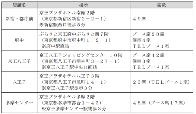 ・新宿・都庁前(京王プラザホテル内) ・府中(ぷらりと京王府中内)