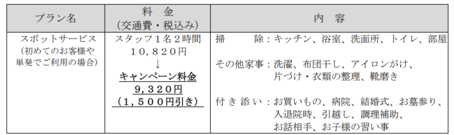 キャンペーン期間中、京王線・井の頭線の区間を含む鉄道通勤定期券をお持ちのお客さまを対象に、お部屋・水まわりの掃除やお子様の送迎などを行う家事代行の「スポットサービス」通常10,820円(スタッフ1名2時間、交通費・税込み)が1,500円引きの9,320円(税込み)でご利用いただけます。