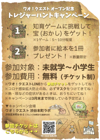この度、 子育て支援事業や福祉支援事業を展開・推進する株式会社イースマイリー(本社:東京都渋谷区、代表取締役:矢澤 修 以下「イースマイリー」)は、小学生を対象として、地域の施設や焦点と連携し、街を探検しながら実践的な社会し体験や探求学習を通じて「探検力」を育むソーシャルスクール『ワオ!クエスト』のオープン記念として、2022年2月25日より知育ゲームに参加して宝(おかし)をゲットできる「トレジャーハントキャンペーン」を2022年3月31日まで開催いたします。