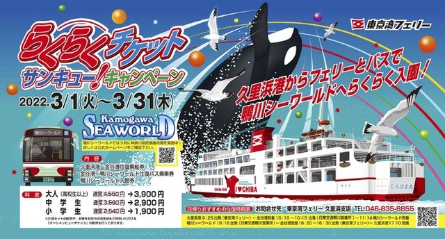 株式会社グランビスタ ホテル&リゾート(本社:東京都千代田区、代表取締役社長:須田貞則)の基幹施設である鴨川シーワールド(千葉県鴨川市、館長:勝俣浩)では、2022年3月1日(火)~3月31日(木)の期間限定で、フェリー・路線バス・水族館のセットプランがさらにお得に利用できる「らくらくチケット サンキュー!キャンペーン」を実施します。
