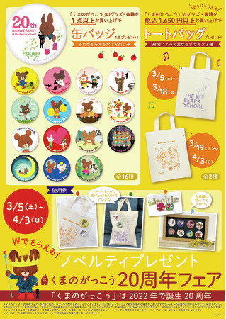くまのがっこう誕生20周年を記念し、3/5(土)~4/3(日)まで、全国のお店で「くまのがっこう 20周年フェア」を開催。期間中、対象の店舗でお買い物をして頂いた方に、オリジナルノベルティをプレゼントいたします。