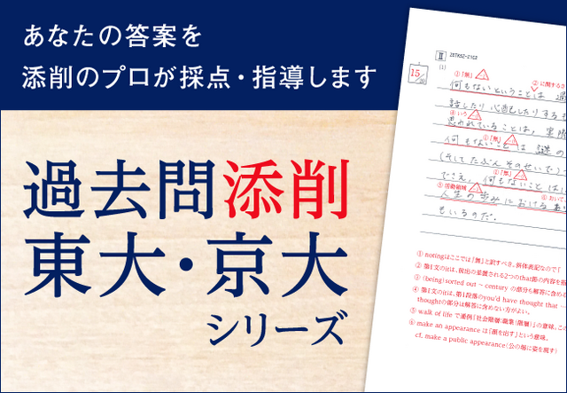 長年の受験指導による知見を生かしながら、個別の答案内容に応じたアドバイスを行います。減点要因や、着眼点、解答の構成などの具体的な指導を受けられるので、「合格答案」をつくるために必要なことが明確になり、東大京大対策の指針となります。