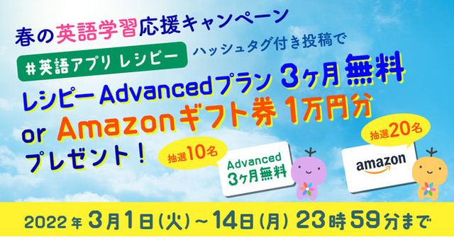 株式会社ポリグロッツ(本社:東京都新宿区、代表取締役:山口隼也)は、言語の壁を超え世界で活躍する日本人が増える事を切望して、3月1日(火)~ 3月14日(月)まで、Twitterキャンペーンを開催いたします。こちらのキャンペーンにご応募いただいた方には抽選で、「レシピーAdvancedプラン3ヶ月無料」もしくは「Amazonギフト券1万円分」をプレゼントいたします。