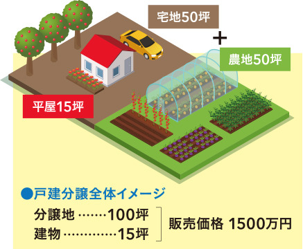 ユニホーが提唱する「1500住宅PROJECT」は、100坪の土地に1LDK(15坪)の住宅を建て、敷地内の畑で「自給自足」できる暮らしを目指して考えられたプロジェクトです。誰もがマイホームの夢をかなえられるよう、土地付き一戸建てを1500万円で提供するということにこだわり、「1500住宅PROJECT」と名付けました。