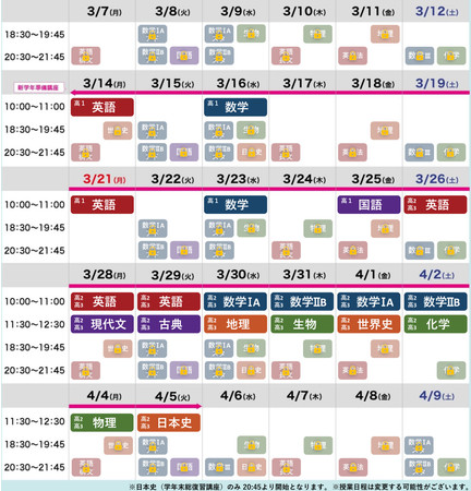 今回は、「自信を持って4月からのスタートを切って欲しい」という思いから、「予習」に重きをおいております。また、別途申込いただいた方には、2022年3月7日(月)~4月5日(火)の期間にて、「復習」に重きを置いた「学年末総復習講座」を無料で受講していただけます。春休み期間中に、「予習」「復習」の双方を“完全無料”で行えることが大きな価値となっています。また4月には、高品質なオンライン上での集団授業を通年で提供する“オンラインLIVE集団塾”をグランドオープンいたします。グランドオープンに先駆けて、高品質な授業を“完全無料”で受講できる「新学年準備講座」をこの機会にぜひお試しください。