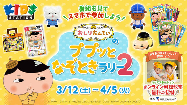 テレビ初放送となる昨年公開の劇場版第3作『映画おしりたんてい スフーレ島のひみつ』のほか、『映画おしりたんてい カレーなる じけん』、『映画おしりたんてい テントウムシいせきの なぞ』など、映画3作品を放送。さらに、TVシリーズ(第1期、第2期)を一挙放送します。さらに、昨夏、キッズステーションで開催し大好評だった放送連動型キャンペーンがパワーアップし、<おしりたんていのププッとなぞときラリー2>として帰ってきます。『おしりたんてい』の放送を楽しんだ後は、なぞときゲームに挑戦してください。抽選でおうちで遊べるおしりたんていのプレゼントが当たります。さらに、オンライン親子料理教室にご招待します。春休みに親子一緒にご参加ください。