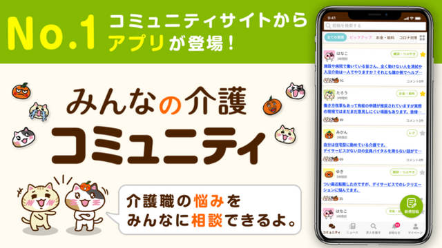 iOS版:https://apps.apple.com/jp/app/%E3%81%BF%E3%82%93%E3%81%AA%E3%81%AE%E4%BB%8B%E8%AD%B7-%E3%82%B3%E3%83%9F%E3%83%A5%E3%83%8B%E3%83%86%E3%82%A3/id1555404963
