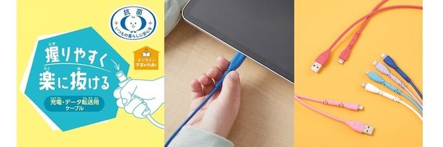 ケーブルグリップ部分を長くすることで、お子さまをはじめ小さな手の方でも握りやすく、抜きやすい、充電およびデータ転送に使えるUSBケーブル 3タイプの登場です。ケーブルのグリップ部分が握りやすい形状になっているため、コネクターから抜く際に無理な力が加わりにくく、楽に抜くことができます。3タイプとも抗菌仕様で、断線しにくい準高耐久ケーブルを使用しています。