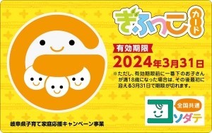 「ぎふっこカード(岐阜県子育て家庭応援キャンペーン事業)」とは、「ぎふっこカード」を持つ子育て世帯(県内に在住する18歳未満の子どもがいる世帯・妊娠中の方がいる世帯)が、岐阜県内の企業・店舗の協力により、買い物や施設利用などをする際に、特典を受けることができる、子育て家庭を地域全体で応援していくことを目的としています。