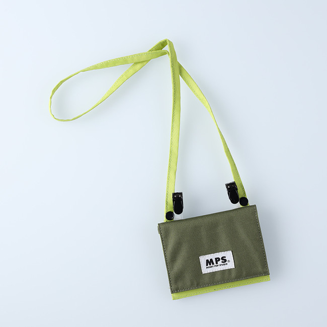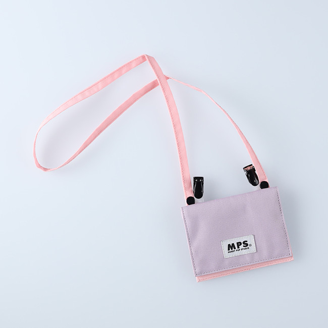 肩からかけられるマルチポーチは、クリップがついており、スカートやパンツに付けられる2WAY仕様です。スタッフからの要望も多かった便利なポケットつきで、ティッシュケースやICカードが入ります。ポケットが洗濯機で洗える素材となっており、お名前ネームもついています。
