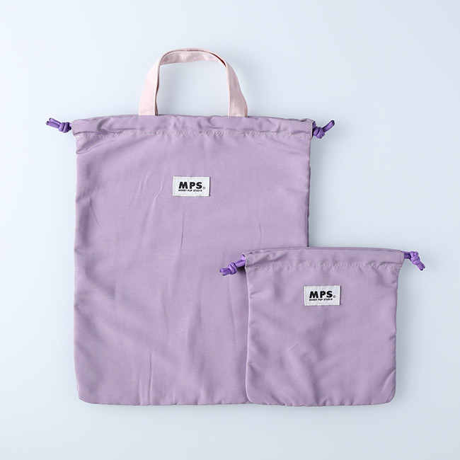 A4サイズが入る大きさの巾着に、コップやマスクなどの小物入れをして使用できる小さいサイズの巾着がセットになった洗濯機で洗える素材のアイテムです。中には小さなポケットもついており、手持ちもついているので、お子様でも運びやすいデザインです。