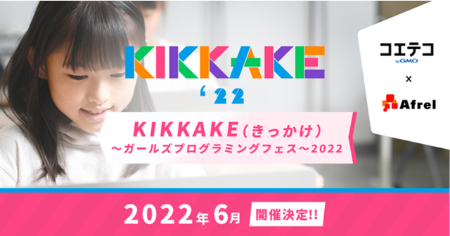 GMOインターネットグループのGMOメディア株式会社(代表取締役社長:森 輝幸 以下、GMOメディア)が運営するプログラミング教育ポータルサイト「コエテコ byGMO」と、民間スクール・家庭・学校・企業まで幅広い層に向け教育支援サービスを提供する株式会社アフレル(代表取締役社長:小林 靖英 以下、アフレル)は、昨年2021年に開催し、1,500名以上が参加し大きな反響を生んだ、小学生~高校生までの女の子を対象とした体験型プログラミングイベント「KIKKAKE(きっかけ)~ガールズプログラミングフェス~」の第2弾を2022年6月に開催することを決定いたしました。