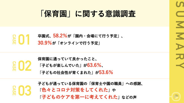 今回の調査では、小さなお子様がいるご両親が、卒園式を迎えるにあたって、保育園を活用したメリットや、保育士さん・職員に対し、たくさんの感謝の声が届きました。特に、コロナ禍を保育園と共に乗り切りったことで、コロナ対策への徹底に関する感謝の声が多く挙がりましたが、小学校入学前に協調性が身についたといった、園児の社会性についての言及もありました。今後もしばらくはコロナと向き合う日々が続きますが、医療関係者だけでなく、日本の未来を担う子どもたちを日々支えるために奮闘してきた保育士、そして職員の皆様に感謝の意をお伝えできれば幸いです。