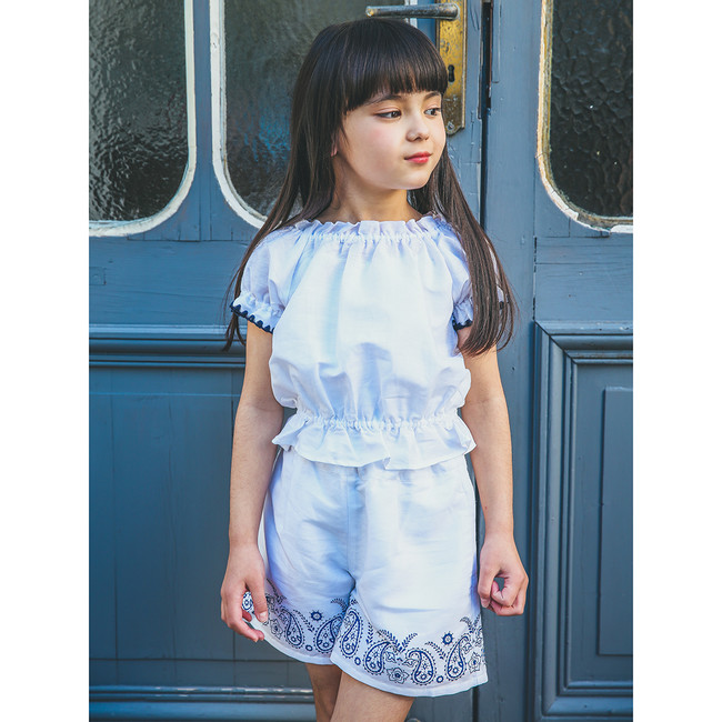 ウエスト部分のフリルとギャザーたっぷりのお袖でとことん女の子らしく、同じ素材のキュロットとのセットアップコーデがおすすめです。