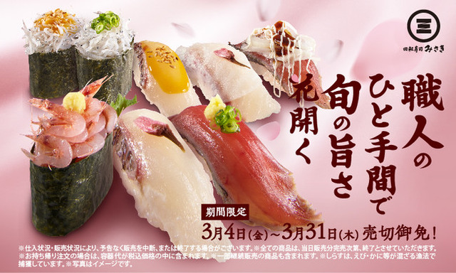 株式会社FOOD & LIFE COMPANIES(本社:大阪府吹田市、代表取締役社長 CEO:水留 浩一)の子会社である株式会社 京樽(本社:東京都中央区、代表取締役社長:石井 憲)が展開する「回転寿司みさき(旧:海鮮三崎港)」では、桜が咲く季節に水揚げされる「桜たい(真たい)」に、駿河湾産の生の「桜海老」など、鮮度抜群、旬の旨さを満喫できる期間限定商品を3月4日(金)から販売いたします。