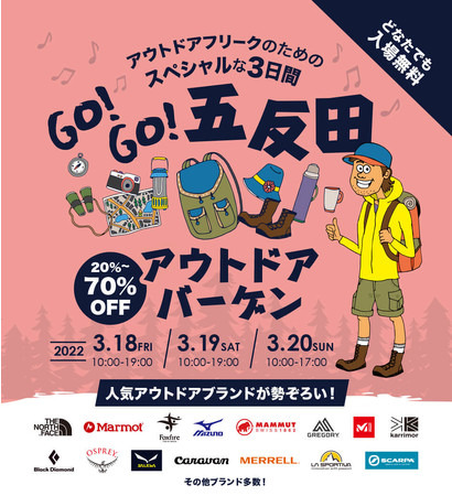 登山・クライミング・アウトドア用品総合専門店、クライミングジムを運営する株式会社好日山荘(本社:兵庫県神戸市、代表取締役社長 池田 真吾)は、3月18日(金)~20日(日)の3日間、五反田TOCビルにて「GO!GO!五反田アウトドアバーゲン」を開催します。