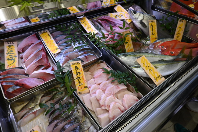 【鮮魚】埼玉県の魚市場から仕入れた丸魚や刺身が並びます。