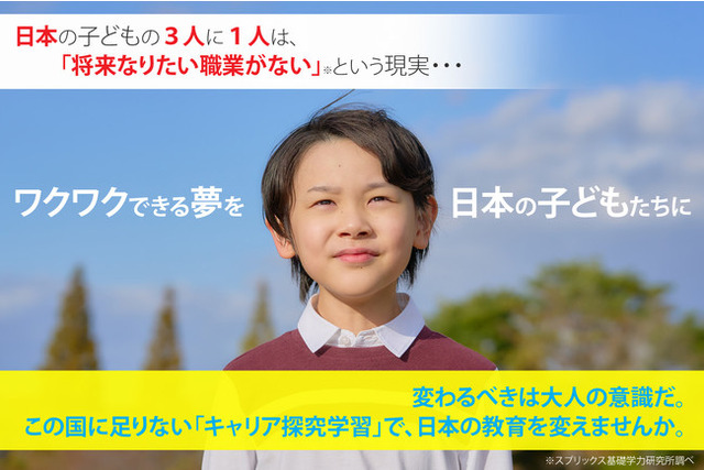 日本の子どもの3人に1人が「なりたい職業がない」という現実…。その割合は、実に世界の5倍(日本30.6% 世界6.1%)※1です。「なぜ勉強するのか」明確な答え、そして将来なりたい姿を持たぬまま今日も、目の前の偏差値や順位のために、子どもたちは机に向かっています。こんな日本の教育を変えたい、変えるにはどうすれば良いのだろうか? そう思った時、"今の日本にはない、子どもたちが夢を持つための教育サービス”を自分達で作ろうと考えました。日本の子どもたちに「かっこいい大人への憧れ」、「ワクワクできる夢」を届ける事業をスタートさせるべくクラウドファンディングを活用することにいたしました。