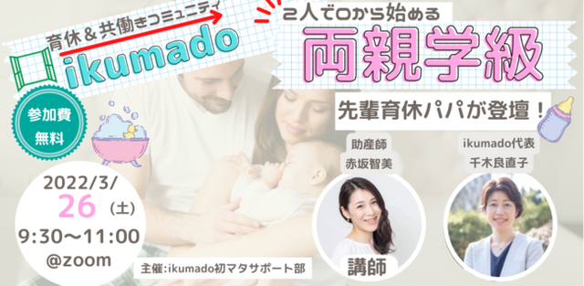育休&共働きコミュニティikumado(イクマド)を運営する株式会社COEOは、コロナ禍で不安の多い初めての出産を迎える妊婦さんとパートナーの方向けに、「2人で0から始める両親学級」イベントを2022年3月26日(土)にオンラインにて開催します。