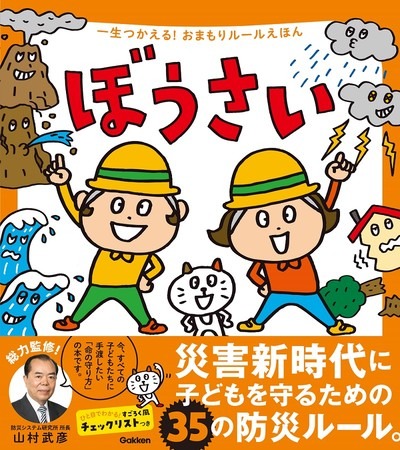 本書を監修したのは、『ひるおび!』や『羽鳥慎一モーニングショー』出演でおなじみの防災システム研究所所長・山村武彦氏。イラストは、サイゼリヤキッズメニュー間違い探しでおなじみのthe rocket gold star氏。防災に対する心構えや、実際に災害が起きたときにとるべき行動を35のルールとしてまとめています。また、ひと目でわかって楽しい「すごろく風ルールチェックリスト」や、防災ポーズ集や非常持ち出し袋持ち物リストを掲載。保護者向けページでは「避難情報」の整理や災害用伝言ダイヤルについても解説しており、保護者が見てもためになる情報が満載です。