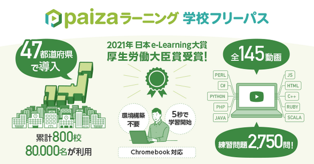 「paizaラーニング 学校フリーパス」は、月額1,078円(税込)の初学者向け動画プログラミング学習サービス「paizaラーニング」の全170レッスン、1,450学習動画、2,650問の演習課題を小・中・高・大学・専門学校向けにすべて無料で提供するサービスです。受講者は6段階で評価される「paizaスキルチェック」の結果をもとに、自身のスキル・能力にあった学習ができます。