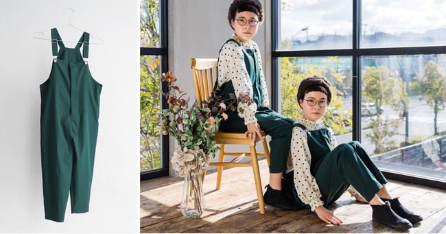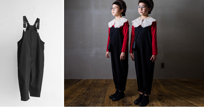 新発売のコラボアイテムであるサロペットはスッキリとしたシルエットにお子様でも着脱しやすい前開きボタン&ファスナー。シワになりにくく、サラッとした動きやすい生地で快適に着用していただけます。