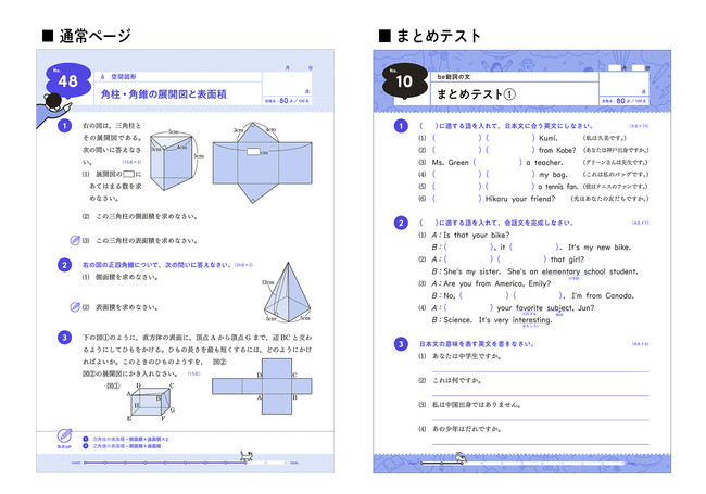 また、単教科・5教科ともに「総復習テスト」のページも設けられており、テスト前の力試しにもご使用いただけます。
