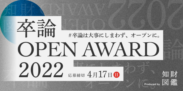 株式会社知財図鑑(住所:東京都中央区日本橋横山町6-14 日本橋地下実験場 共同代表者:出村光世 / 荒井亮)は、大学から実社会に仮説のバトンをつなぐためのきっかけを生むことを目指し、「世界の進化に貢献する可能性の高い研究」に取り組む学生を対象とした「卒論OPEN AWARD2022」の募集を2022年3月9日開始しました。本年度の開催は昨年度からパワーアップし、優秀論文に選ばれた受賞者にはピッチイベントでプレゼンテーションの場を設けることで、より社会実装を高めたアワードとして開催します。