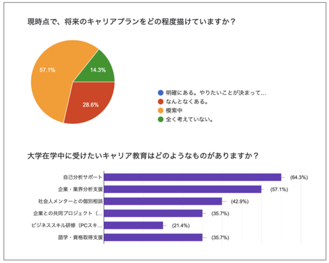 弊社で同志社大学政策学部風間ゼミに所属する学生を対象に、プログラムの事前ヒアリング、アンケート調査を実施したところ、7割以上の学生が自身のキャリアプランを描けていない状況であることが浮き彫りとなりました。また、多くの学生が企業や企業で働く人材との接点を望んでおり、社会に出ることやキャリア形成における具体的なイメージを持つことに難しさを感じているという意見が多くあがりました。
