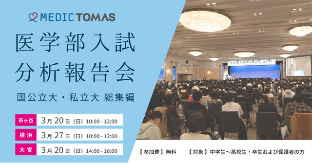 メディックTOMASでは3月、首都圏3会場にて「医学部入試分析報告会 国公立大・私立大総集編」を開催いたします。22年度医学部入試の総括をしながら、首都圏国公立大学や慶應義塾の医学部入試問題を分析。ご好評の現役医大生インタビューも実施し、この春メディックTOMASで合格を果たした先輩も登壇予定です。