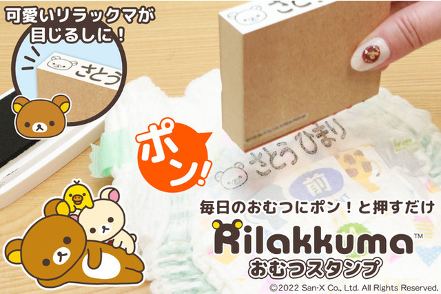 ゆるいマイペースなしぐさや表情で癒しながら、ポン!と押すたびにおむつにかわいくお名前つけができる「リラックマ おむつスタンプ」。