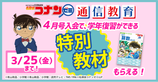 3月25日(金)までに小2-小6コースの2022年度「4月号」に新規でご入会されると、「特別教材」として『名探偵コナンゼミ 通信教育 2021年度3月号(PDF版)』がついてきます(※)。