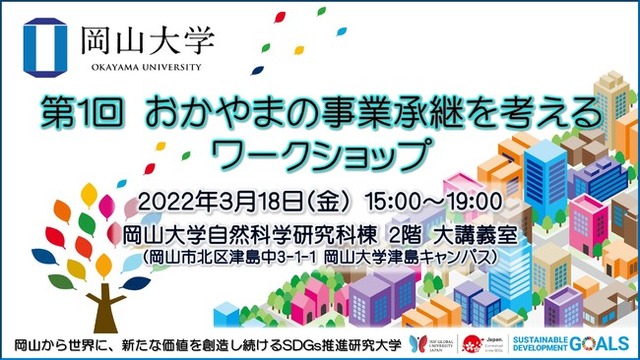 国立大学法人岡山大学(本部:岡山市北区、学長:槇野博史)の研究推進機構産学官連携本部と企画戦略室(URA室)は、2022年3月18日(金) 15:00~19:00に「第1回おかやまの事業承継を考えるワークショップ」を、岡山大学津島キャンパスの岡山大学自然科学研究科棟2階大講義室で開催します。