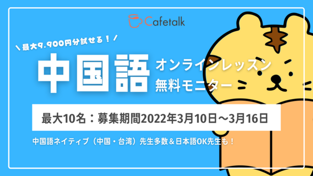 世界中の講師と生徒をつなぐオンライン習い事サイト「カフェトーク(http://cafetalk.com/)」を運営する株式会社スモールブリッジ(本社:東京都渋谷区、代表取締役:橋爪小太郎)は、オンライン/マンツーマンで実施される中国語レッスンをお試しいただけるモニター様10名を2022年3月10日~3月16日の日程で募集しています。